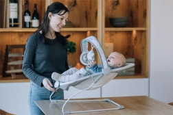 Durchdachte Details wie der abnehmbare Spielbogen mit Spielzeugen zur Förderung der Motorik und Vorstellungskraft, der 3-Punkt-Gurt für sicheren Halt im Sitz sowie der pflegeleichte, waschbare Bezug machen die Wippe zu einer praktischen Wahl für jeden Haushalt.