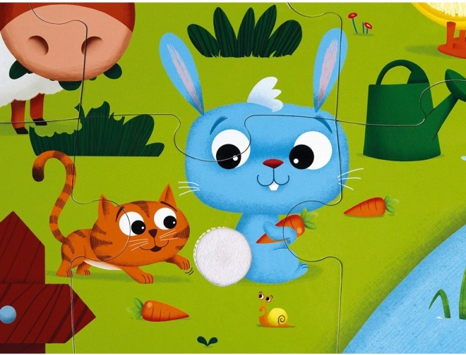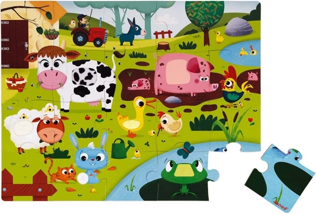 Kinderpuzzle von JANOD mit Tiermotiven vom Bauernhof. Einige Teile haben eine spezielle Oberflächenbehandlung – eine Textur, die auch für echte Tiere charakteristisch ist. Das Puzzle fördert logisches Denken, Aufmerksamkeit und Gedächtnis der Kinder. Mithilfe des Puzzles lernen sie Farben, Formen und Objekte zu erkennen, die Handmotorik wird entwickelt und Kinder lernen, die Beziehung zwischen Teilen und dem Ganzen zu verstehen. Dank der speziellen Elemente am Puzzle lernen Kinder, verschiedene Oberflächen durch Tasten wahrzunehmen. Maße des zusammengesetzten Puzzles ca. 65 × 50 cm