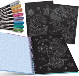 Schwarze Blätter mit detaillierten Umrissen von Tieren und Fantasiemotiven erleichtern das Ausmalen ohne Skizzieren. Ideal für einen schnellen Start und zum Entspannen.