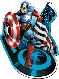 Eine dynamische Illustration mit einem Helden im Rot-Blau-Trikolore-Stil und einem Sternenschild verleiht dem Puzzeln Energie und die Atmosphäre der Comicwelt.