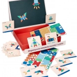Im Set enthalten sind 20 Vorlagenkarten mit abgestuften Schwierigkeitsgraden, die Kinder Schritt für Schritt durchs Legen führen. Die linierte Magnettafel (26 × 19 cm) hilft, Übersicht und Genauigkeit zu bewahren. Das Spielzeug ist aus sicheren Materialien gefertigt und entspricht der CE-Norm.