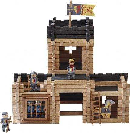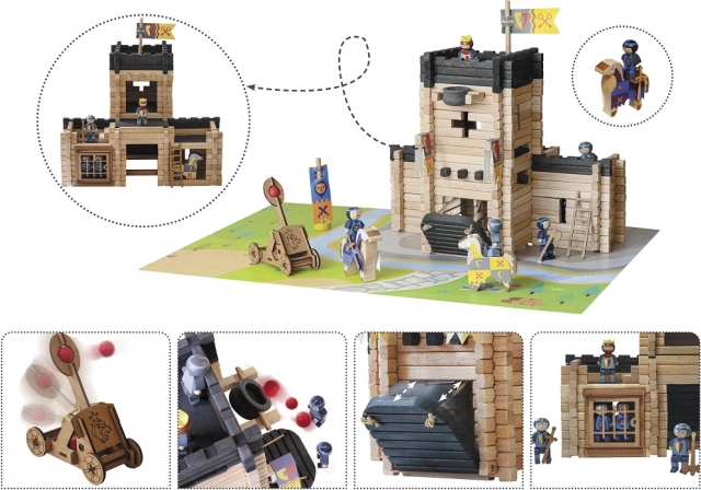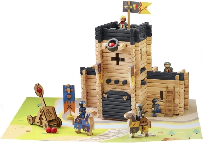 Baue eine Festung mit Wehrgängen, Zugbrücke und Katapult, das dem Spiel Action und Taktik verleiht.