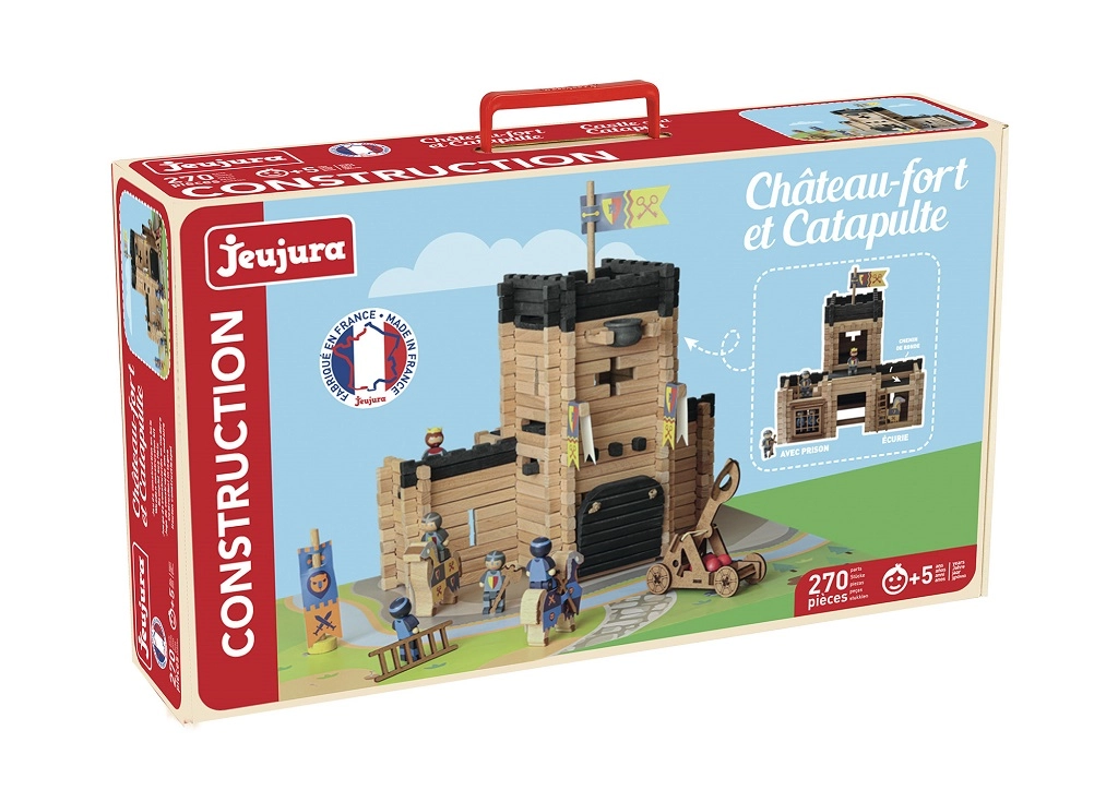 Alles wird in Frankreich unter Verwendung von sicheren, wasserverdünnbaren Farben und Lacken hergestellt. Das Set ist in einem robusten Karton-Köfferchen untergebracht, bedruckt mit pflanzlichen Tinten, und enthält eine übersichtliche Anleitung. Der Baukasten ist mit weiteren JEUJURA-Sets kompatibel, sodass nach und nach eine ganze mittelalterliche Stadt entstehen kann.