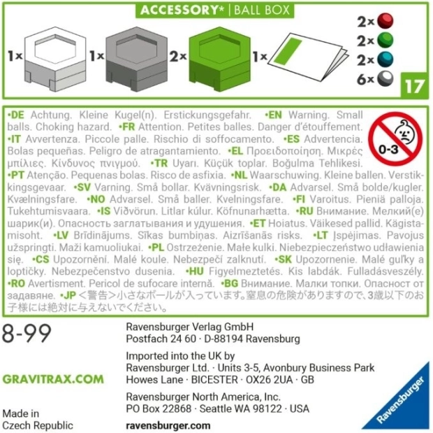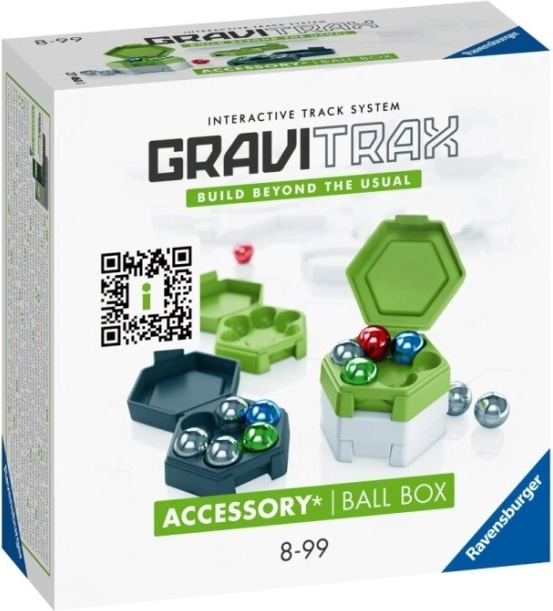In diesem GraviTrax Set finden Sie 12 bunte Kugeln: 6 silberne, 2 rote, 2 blaue und 2 grüne. Die Kugeln können nach Farbe sortiert oder nach Ihrer Vorstellung gemischt werden. Teil des Sets sind auch 4 Aufbewahrungsboxen - 2 grüne, 1 weiße und 1 graue. Diese Boxen sind stapelbar, was die Lagerung auch in kleineren Bereichen ermöglicht.