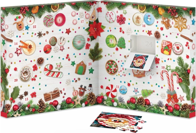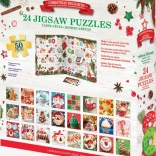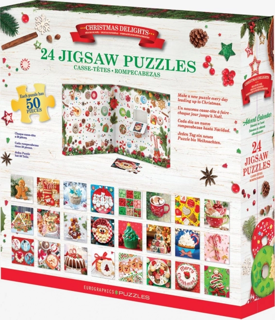 Dieser Adventskalender von EUROGRAPHICS bringt Freude in jeden Dezembertag. Hinter 24 Türchen finden Sie 24 unterschiedliche Puzzle, jeweils mit 50 Teilen und einem schönen Weihnachtsmotiv. Die Bilder sind quadratisch und messen fertiggestellt ca. 12,5 × 12,5 cm. In jedem Türchen liegt zudem eine Vorlage für leichteres Puzzeln, und auf der Rückseite der Verpackung finden Sie eine Übersicht aller Motive.