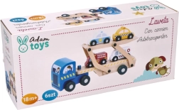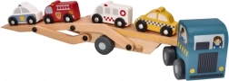 Dieser Holz-Autotransporter bietet dank seiner Vielseitigkeit und hochwertigen Verarbeitung großen Spaß für Kinder. Er enthält einen abnehmbaren Anhänger, der vier niedlich bemalte Holzfahrzeuge aufnehmen kann.