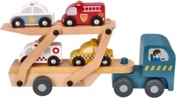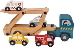Das Set enthält ein Polizeiauto, ein Feuerwehrauto, einen Krankenwagen und ein Taxi, alle aus hochwertigem Holz mit detaillierten Bemalungen.
