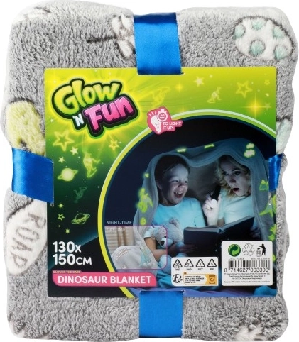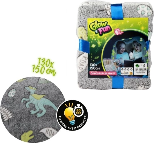 Diese graue Plüschdecke mit niedlichen Dinosauriermotiven erhellt jeden Abend. Für ein einfaches Leuchten im Dunkeln reicht kurzes Aufladen mit Licht – je intensiver und länger, desto stärker und länger anhaltend der Effekt. Ideal zum Relaxen auf dem Sofa, fürs Kinderzimmer oder als originelles Geschenk.