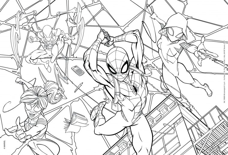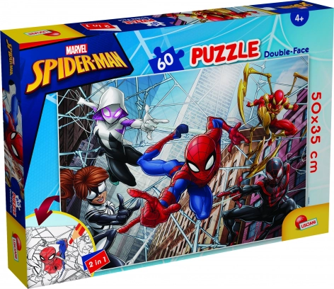 Beidseitiges Puzzle SPIDER-MAN 60 Teile: farbiges Motiv legen und Rückseite ausmalen. Maß 50 × 35 cm. Spaß und Kreativität für Kinder.