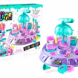 Zentrale Mischstation, Becher, Pulver, Glitzer und Werkzeuge – alles, was Kinder zur Herstellung ihres eigenen Schleims brauchen, ohne unnötige Unordnung.
