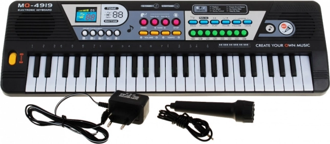 Mit Lautstärke- und Temporegelung, Aufnahmefunktion und Programmierung, Stop-Taste und Modus S.E/Play. Das beiliegende Mikrofon ermöglicht Gesang und Sprachaufnahmen, der integrierte Lautsprecher sorgt für ausreichende Lautstärke. Dank Stromversorgung per USB-Adapter oder 4× AA-Batterien können Sie überall spielen.