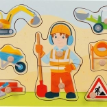 Entdecken Sie ein hochwertiges Holz-Einlegepuzzle, das Kinder spielerisch in die Welt der Baustelle einführt. Die einzelnen Teile mit Knöpfen lassen sich auch von kleineren Kindern gut greifen und trainieren so die Feinmotorik und die Präzision der Bewegungen. Die Holzgrundplatte mit Rahmen unterstützt das korrekte Platzieren der Teile und stärkt die Konzentration.