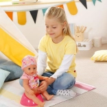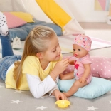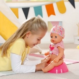 Die Puppe trinkt aus der Flasche, isst Brei, macht Pipi in die Windel oder aufs Töpfchen, weint Tränchen und kann auch groß machen. Authentisches Spiel, das Empathie und Fürsorge fördert.