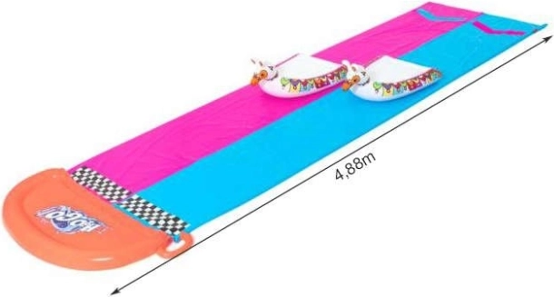 Zwei parallele Bahnen mit 4,88 m Länge ermöglichen Kindern Wettrennen und einen langen, schnellen Rutsch mit Wassersprühdüsen entlang der gesamten Strecke.
