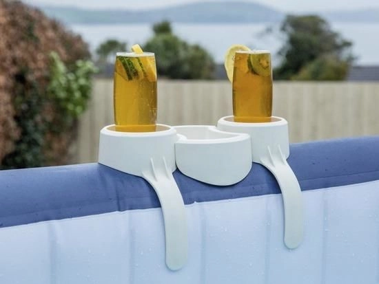 Das clevere Zubehör für entspannte Momente im Whirlpool: doppelter Getränkehalter mit zentralem Tablett. Bietet zwei runde Fächer für Gläser, Dosen oder Flaschen und in der Mitte einen praktischen Platz für Kleinigkeiten – Brille, Smartphone oder Snacks. Das robuste Design aus PP/ABS ist für Wasser und Sonne gemacht.