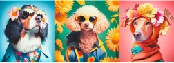 Drei stilvoll gekleidete Hunde mit Sonnenbrillen und Blumen vor buntem Hintergrund ergeben ein verspieltes Bild, das jeden Raum erstrahlen lässt.