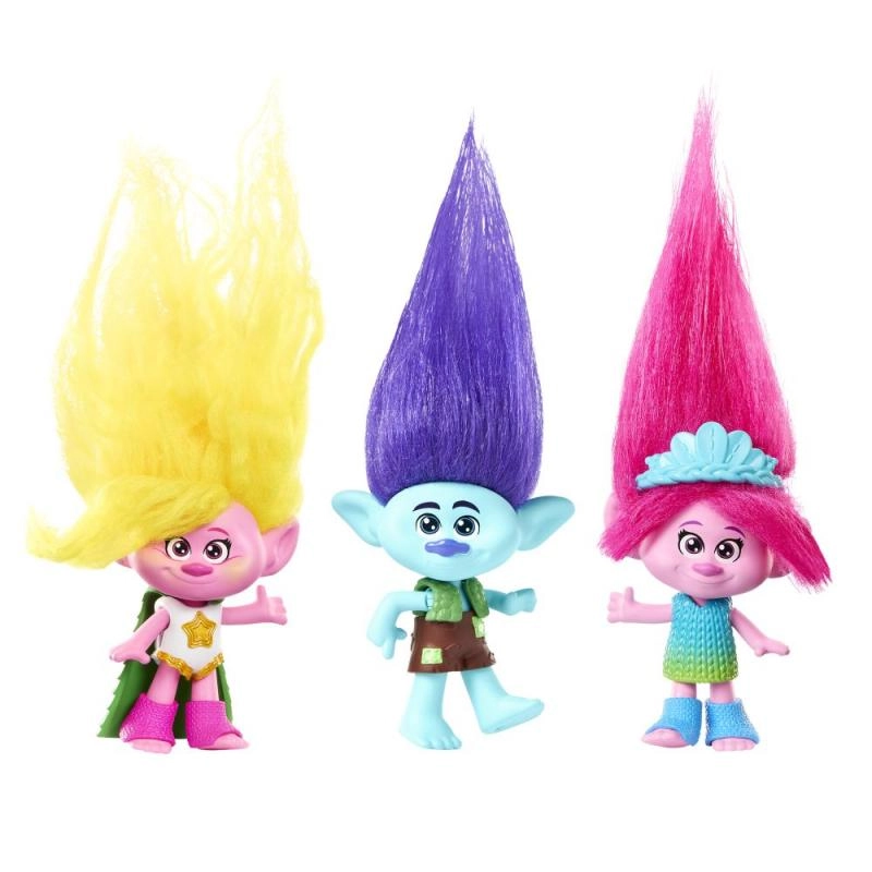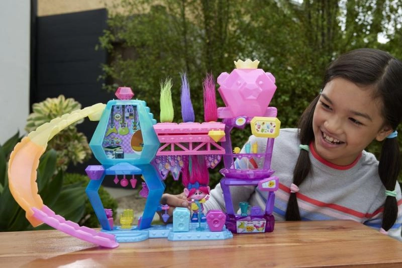 Entdecke die ikonische Kulisse aus dem Film TROLLS BAND TOGETHER im spielerisch bunten Set Mount Rageous. Kinder können Poppys lange Haare stylen, Kleinigkeiten in den Hair Pops verstecken, Konzerte auf der Bühne veranstalten und über die Rutsche zwischen den Ebenen sausen. Mehr als 25 Mode- und Story-Accessoires (Mikrofon, Kleiderständer, Gitarre mit „Edelstein“ und mehr) regen die Fantasie an und laden in die Rolle der Königin Poppy ein.