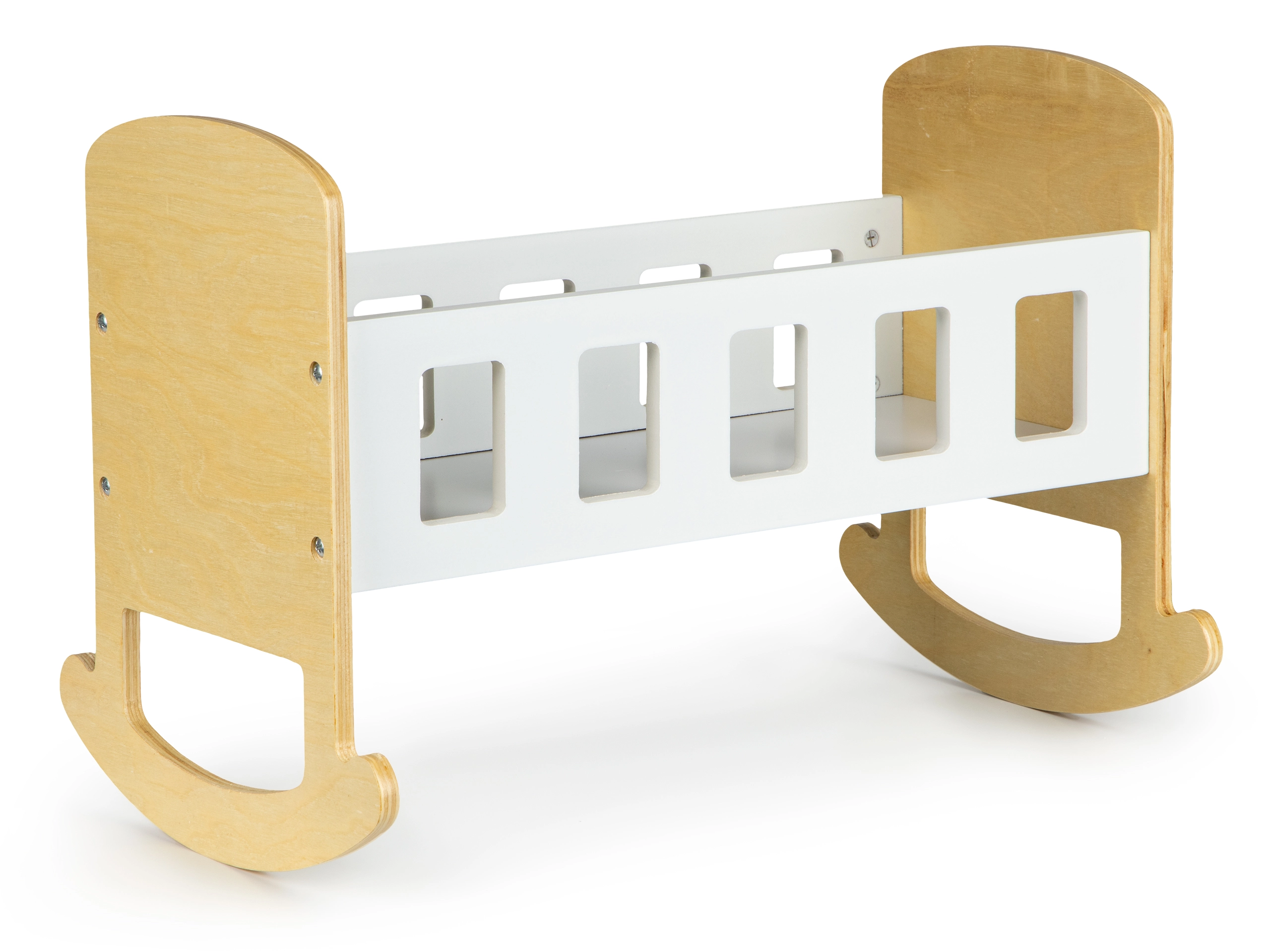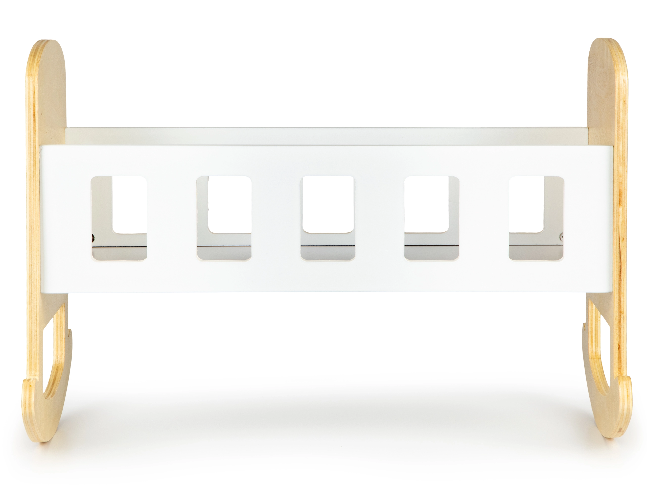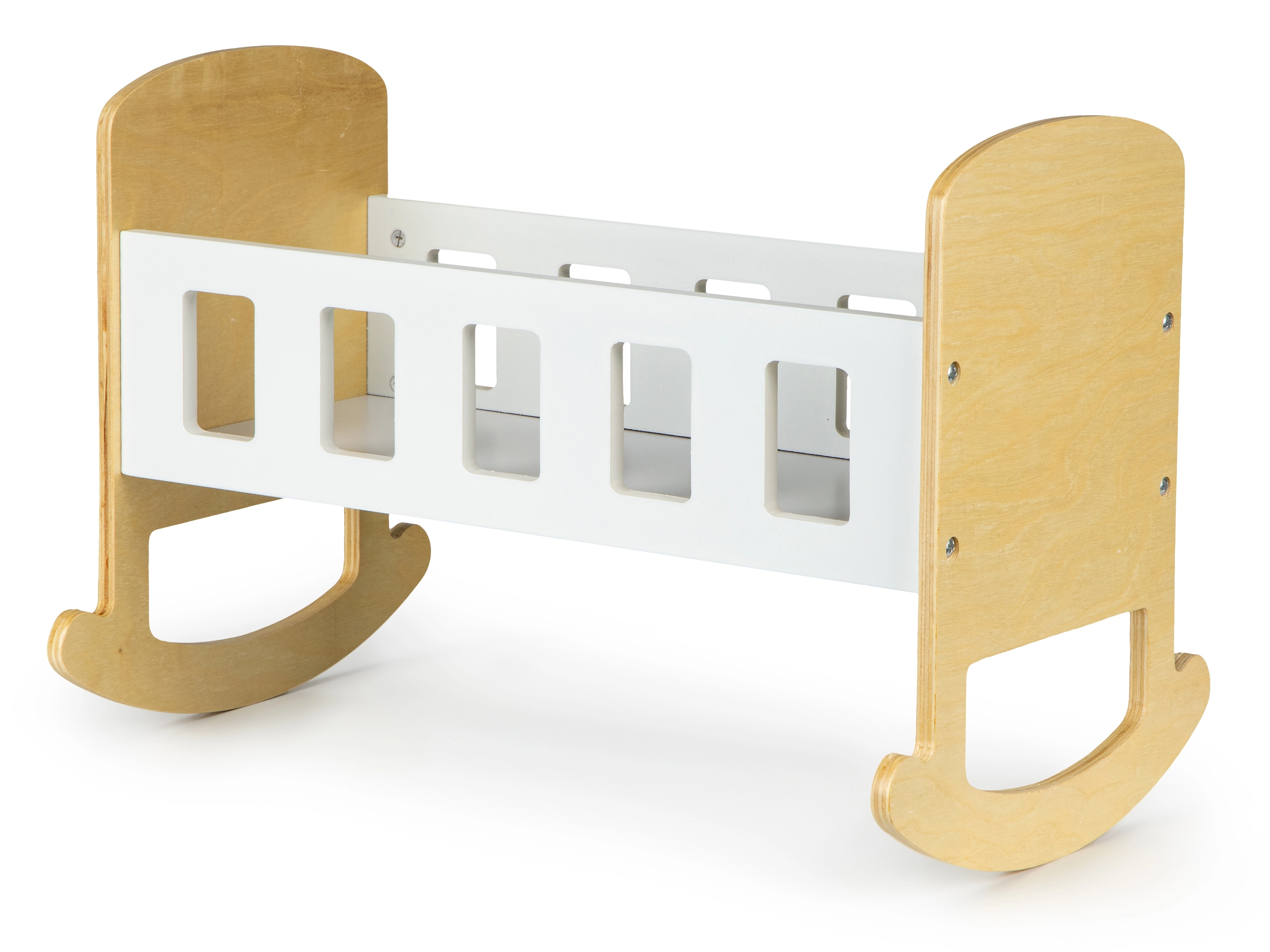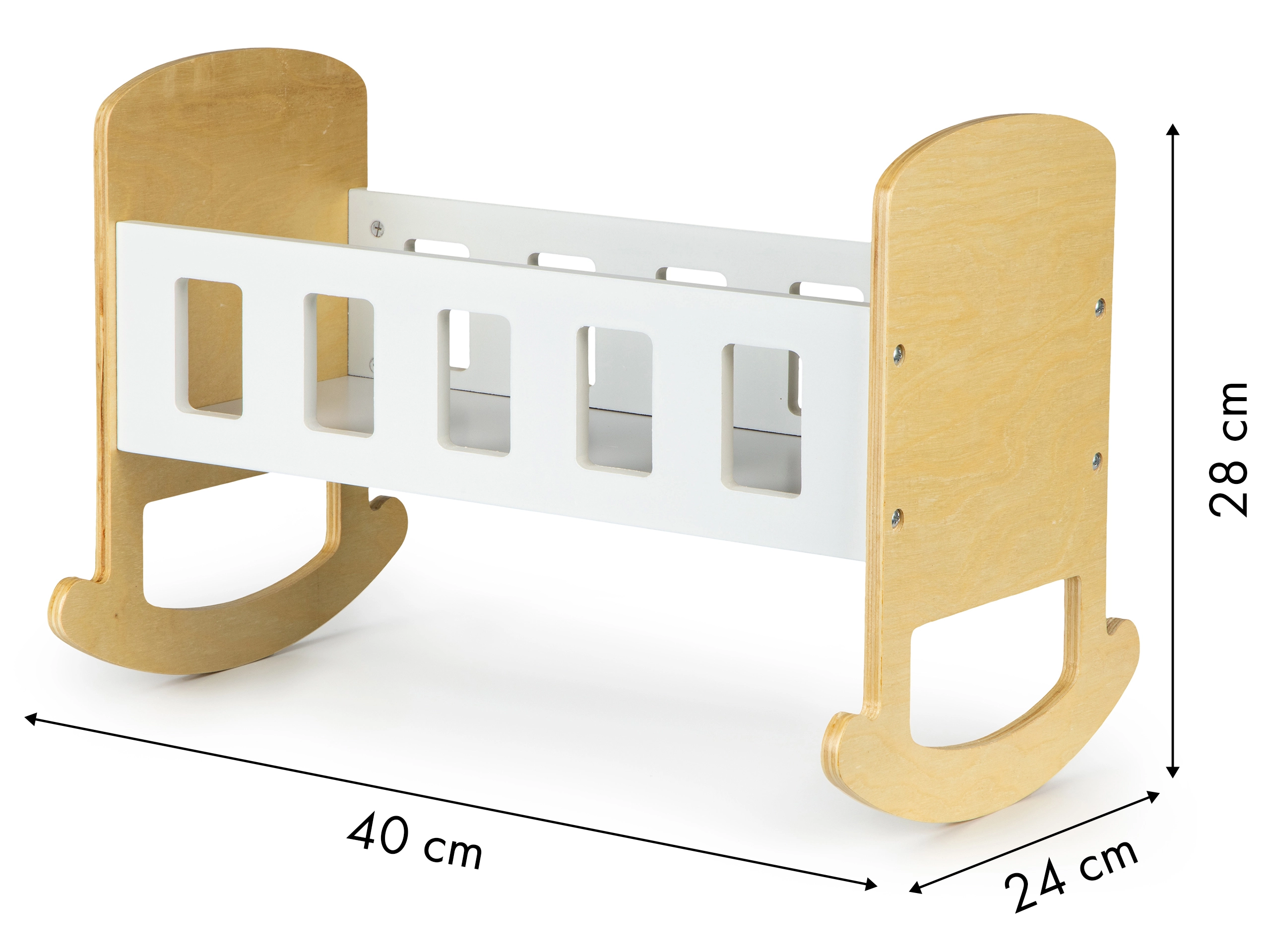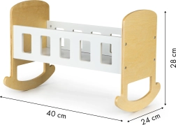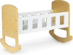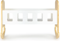 Die Wiege besteht aus hochwertigem Sperrholz und ist mit sicheren Farben lackiert. Glatte, abgerundete Kanten sorgen für Komfort im täglichen Gebrauch. Das minimalistische Design lässt sich leicht mit anderen Möbeln kombinieren und kann zudem mit eigenen Dekorationen personalisiert werden – zum Beispiel mit dem Namen der Lieblingspuppe.