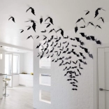 Das Set enthält 3 Fledermäuse mit Spannweiten von 47, 37 und 31 cm, die Ihrem Interieur einen markanten „Wow“-Effekt verleihen. Das glänzende Schwarz und die 3D-Form ermöglichen dramatische Installationen an Wänden, Fenstern oder Türen.