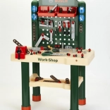 Die Werkbank bietet viel Platz für alleiniges oder gemeinsames Spiel: Die breite Arbeitsfläche, Aufbewahrungsboxen für Zubehör sowie Löcher zum Schrauben und Hämmern fördern Motorik, Geduld und Fantasie. Dank der umfangreichen Ausstattung üben Kinder grundlegende „handwerkliche“ Tätigkeiten und lernen, Ordnung im Werkzeug zu halten.