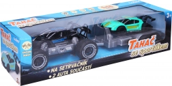 Spaßiges Set für kleine Fahrer: Ein Sattelschlepper mit PKW, 45 cm lang, sorgt dank Schwungrad in beiden Fahrzeugen für jede Menge Action. Ideal für Hausrennen und kreatives Spielen, in tschechischer Verpackung. Farbkombination: Sattelschlepper schwarz, Auto grün.