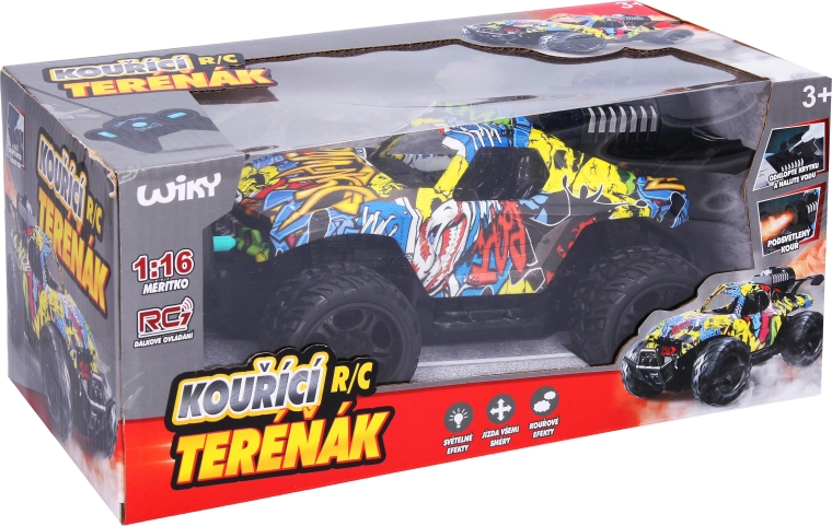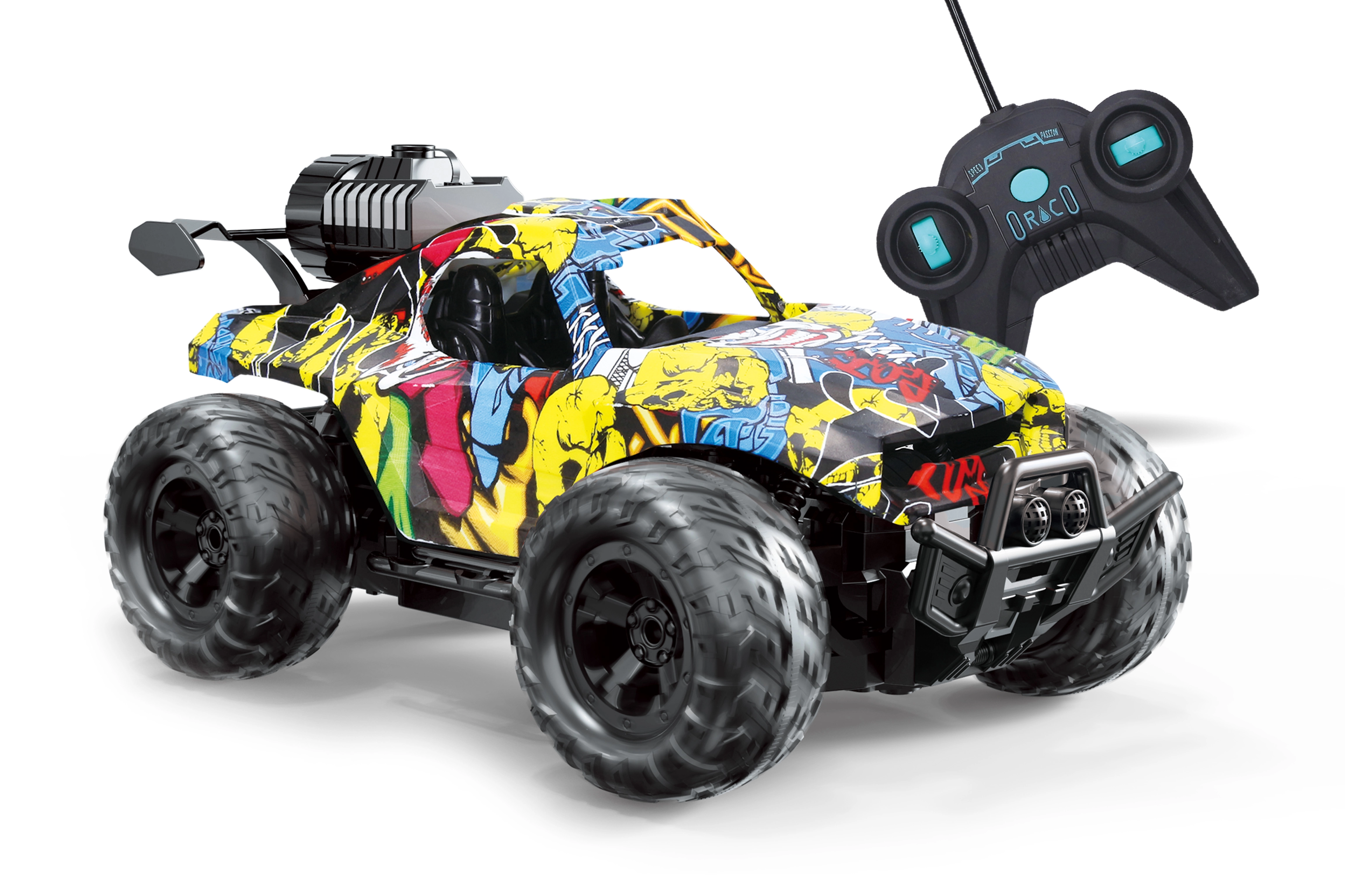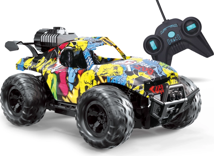 Dieses geländegängige RC-Auto im coolen Graffiti-Stil sorgt dank der Kombination aus Licht- und Raucheffekten für viel Spaß. Der Rauch wird per Taste am Controller aktiviert und wirkt dank des einfachen Nachfüllens von Wasser in den Tank realistisch. Mit den Abmessungen 24 × 14,5 × 10,6 cm lässt es sich hervorragend steuern und eignet sich für Einsteiger ebenso wie für kleine Rennfahrer.