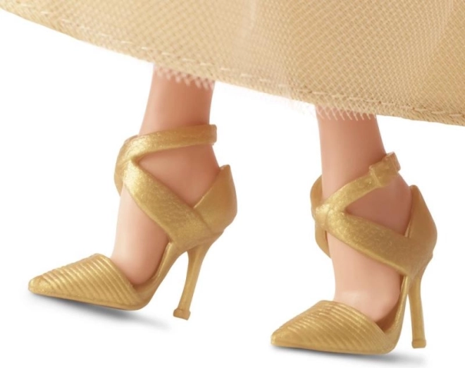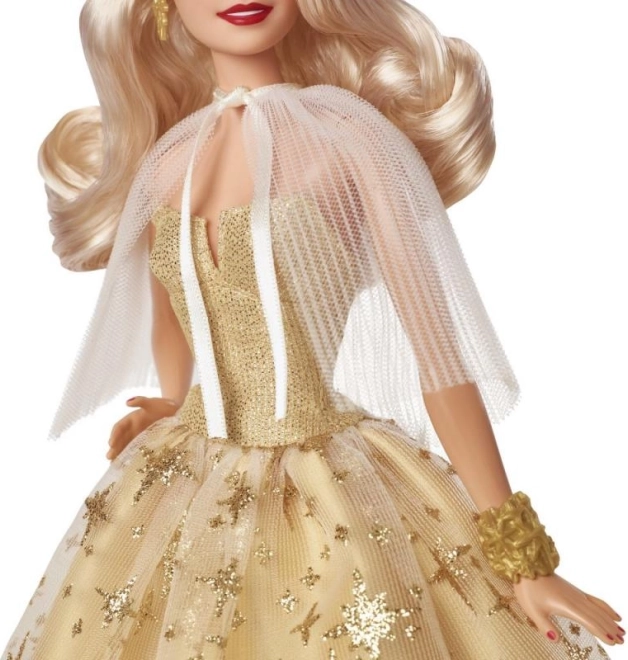 Barbie trägt ein Champagnerkleid, das mit goldenen Sternen bedeckt ist und den Zauber der festlichen Stimmung einfängt.