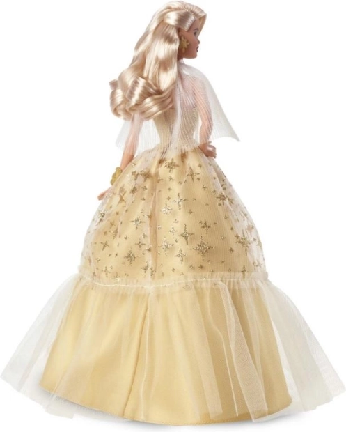 Die Barbie Holiday Festliche Ausgabe 2023 ist kunstvoll gestaltet für diejenigen, die ihrer Sammlung Glanz verleihen oder jemandem ein außergewöhnliches Geschenk machen möchten. Die Puppe hat platinblonde Haare in glamourösen Locken, ein Champagnerkleid verziert mit goldenen Sternen und einen transparenten plissierten Umhang. Alles ist perfekt auf ihre goldenen Ohrringe und das Armband abgestimmt.