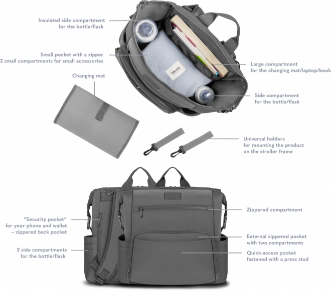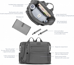 Die durchdachte Aufteilung ermöglicht schnellen Zugriff auf alle wichtigen Dinge für Baby und Eltern. Universelle Schnallen erleichtern die Befestigung am Kinderwagen, und zusätzliche Riemen passen die Größe so an, dass der Rucksack sogar unter den Flugzeugsitz passt.