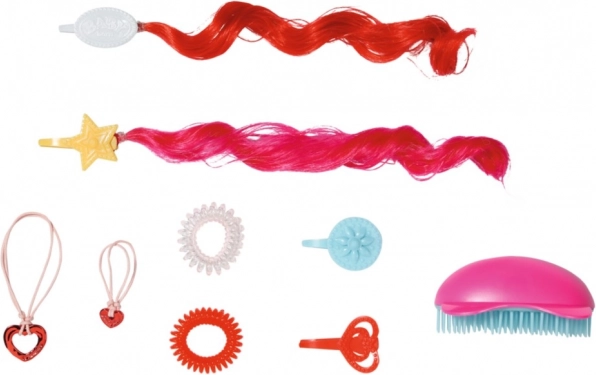 Lange blonde Haare können mit den beiliegenden Accessoires gestylt werden, einschließlich Spiralgummis und bunter Strähnen.
