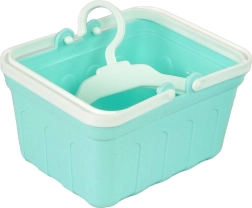 Der praktische Korb mit Griff erleichtert das Tragen der Wäsche, und zwei Kleiderbügel helfen, Ordnung zu halten – das ideale Zubehör für ein realistisches Spiel.