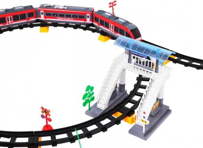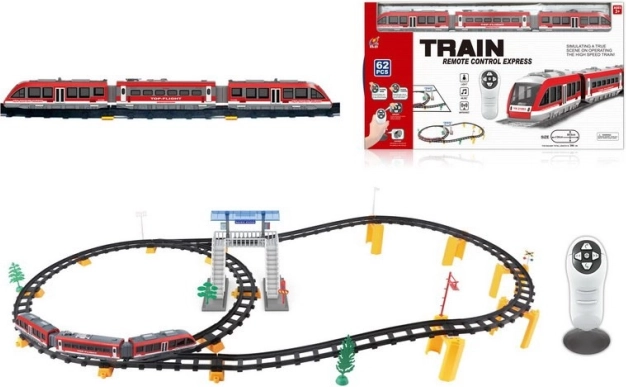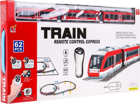 | | Das große Zugset mit Schienen ist für Kinder ab 3 Jahren bestimmt. Das Set besteht aus 62 Elementen, die Streckenlänge beträgt bis zu 396 cm. Der Zug wird mit einer Fernbedienung gesteuert und fährt im oder gegen den Uhrzeigersinn. Der Zug gibt Fahrgeräusche von sich und die vorderen oder hinteren Lichter leuchten je nach Fahrtrichtung. Das Spielzeug wird mit AA-Batterien betrieben – 2 x 1,5 V (Fernbedienung) und 3 x 1,5 V (Zug). | |