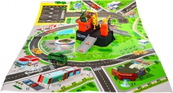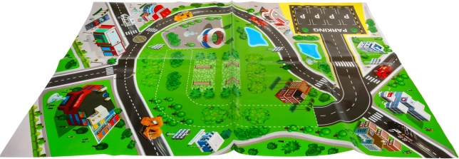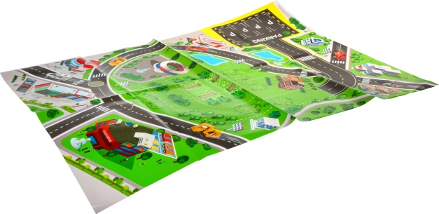 Die Matte mit Maßen von ca. 78 × 58 cm zeigt Straßen, Parkplätze und Gebäude – ideal, um grundlegende Verkehrssituationen zu erlernen.