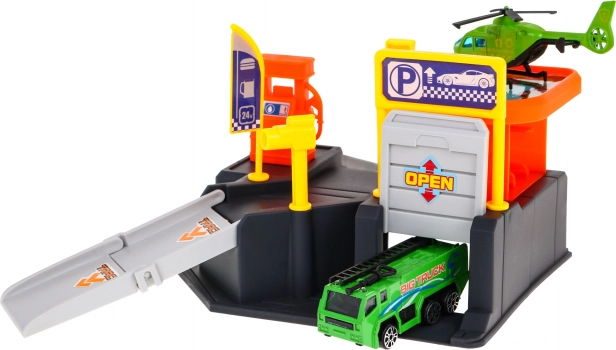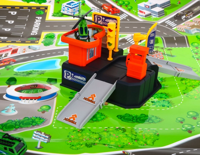 Dieses bunte Kunststoff-Set verwandelt das Kinderzimmer in ein kleines Verkehrszentrum. Das zweigeschossige Parkhaus mit Rampen und Helipad wird durch eine übersichtliche Spielmatte mit Stadt und Straßen ergänzt, auf der Kinder mit dem Auto fahren und mit dem Hubschrauber landen können. Dank der kompakten Maße passt es leicht ins Zimmer und ist schnell aufgeräumt.