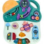 Hinterleuchtete Orgel-Tasten, Melodien, Zahnräder, Schieberegler, Kugeln und eine abnehmbare Rakete halten die Aufmerksamkeit und fördern Feinmotorik, Seh- und Hörsinn.
