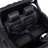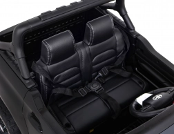 Die kleinen Fahrer freuen sich über Schlüsselstart, LED-Lichter vorne und hinten, ein realistisches Armaturenbrett und umfangreiche Audiofunktionen: Bluetooth, USB, MP3, FM-Radio, Kartensteckplatz und AUX/Mikrofon. Praktisch sind zu öffnende Türen, ein vorderes Staufach unter der Motorhaube sowie ein großer hinterer Kofferraum für Spielzeug. Der Sitz aus schwarzem Öko-Leder mit Sicherheitsgurten sorgt für Komfort und Sicherheit.