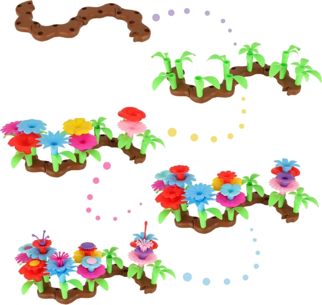 Das Spielen mit diesem Baukasten fördert die Kreativität der Kinder und entwickelt verschiedene Fähigkeiten, einschließlich Feinmotorik und Intellekt. Das Erstellen wunderschöner Sträuße hilft, Konzentration, Fingerpräzision und Hand-Augen-Koordination zu entwickeln.