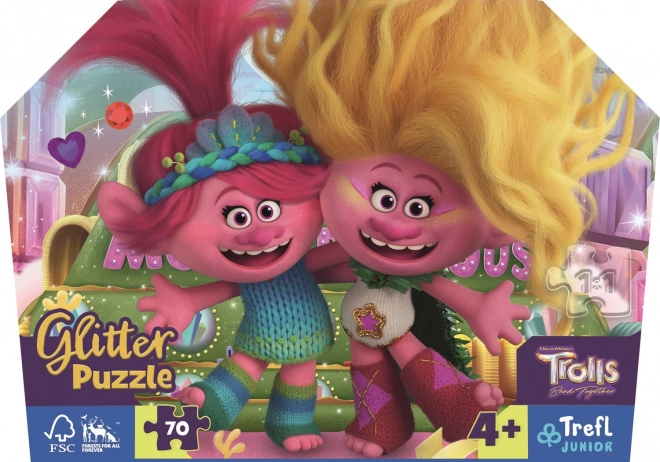Das Puzzle Glitzernde Trolle von der Marke Trefl Junior ist ein großartiges 70-teilige Puzzle für kleine Puzzle-Liebhaber und Filmfans der Trolle. Dank des feinen goldenen Glitzers funkeln die einzelnen Teile und die Verpackung wunderschön.