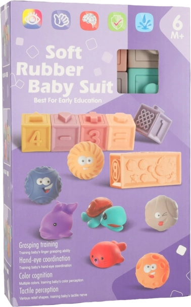 Dieses sensorische Set verbindet Spaß und Lernen in einem. Weiche Silikonwürfel mit Zahlen und Zeichen motivieren Kinder zum ersten Zählen, während vielfältige Texturen und Reliefs Tastsinn und Konzentration fördern. Bälle und Würfel eignen sich ideal zum Turmbauen, Sortieren und freien Spiel.