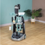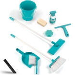 Zum Wagen gehören Besen, Mopp, Kehrschaufel, Handfeger, Eimer, Schwamm und Reinigungsmittel, die Kinder bei ihrer imaginären Reinigungsarbeit voll und ganz beschäftigen.