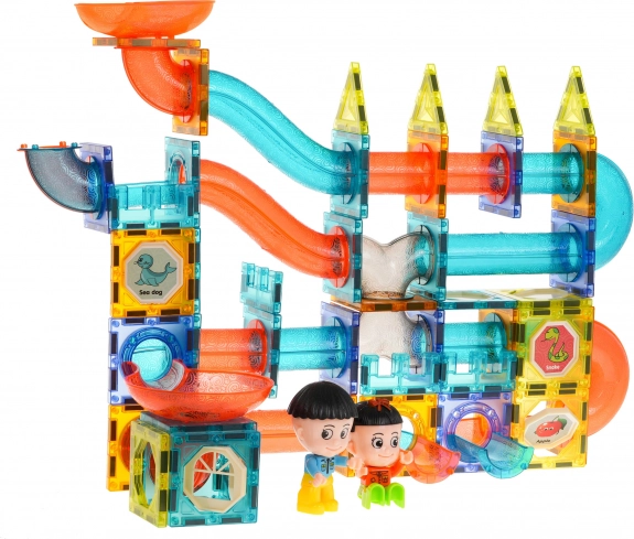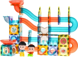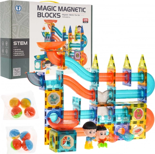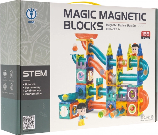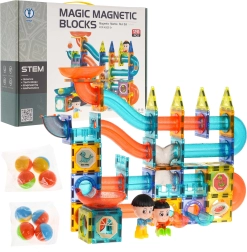 Entdecken Sie die Welt der Kreativität mit diesem farbenfrohen Set mit 128 magnetischen Teilen. Dieses Konstruktionsset ermöglicht es, eine Kugelbahn in beliebiger Anordnung zu bauen. Die Teile bestehen aus hochwertigem Material, sind glatt und sorgfältig verarbeitet. Dank der eingebauten Magnete lassen sie sich leicht verbinden und sorgen für eine stabile Konstruktion. Im Lieferumfang ist eine bebilderte Anleitung zum Aufbau von Beispielbahnen enthalten.