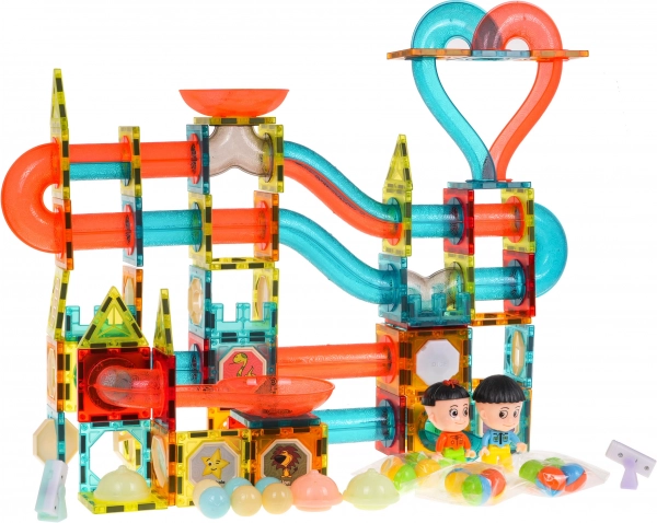 Magnetischer Baukasten für Kinder ab 3 Jahren. Enthält 202 Teile und ermöglicht den Bau einer Kugelbahn in beliebiger Anordnung. Einige Teile werden mit Batterien betrieben; nach dem Einschalten erleuchten pulsierende Lichter die Bahn und das Spiel macht noch mehr Spaß. Die Lichter blinken in 3 Modi: schnell, mittel und langsam – es kann der am besten geeignete für das Kind ausgewählt werden. Einige Kugeln blinken auch nach dem Schütteln. Das Set enthält außerdem farbige Kapseln mit Farbwechsel und zwei LED-Strahler. Stromversorgung: 18 × 1,5 V LR1130, 12 × 1,5 V LR41, 8 × 3 V CR1220 (Batterien sind im Lieferumfang enthalten).