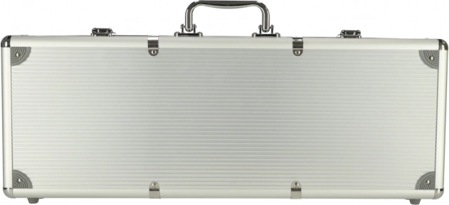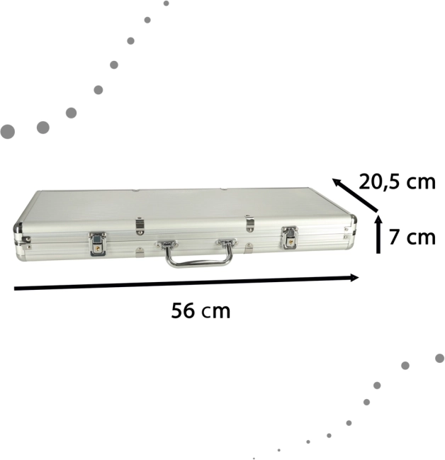 Das Set enthält auch Würfel, die Möglichkeiten für verschiedene Spielarten eröffnen, und Schlüssel für das sichere Verschließen des Transportkoffers. Die Eleganz und Haltbarkeit des Designs machen diesen Koffer zu einem geeigneten Mittel, um Spielkomponenten sicher zu transportieren und aufzubewahren.