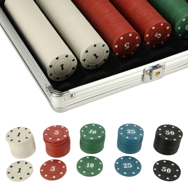Das Set enthält Chips, Karten und Würfel für verschiedene Spielvarianten. Der silberne Koffer sorgt für eine sichere Aufbewahrung der Komponenten und einen einfachen Transport.