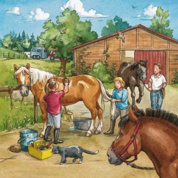 Kinder setzen eine Pflegeszene, das Leben im Stall und einen fröhlichen Ausritt durch die Landschaft zusammen – jeweils 49 Teile in leuchtenden Farben.