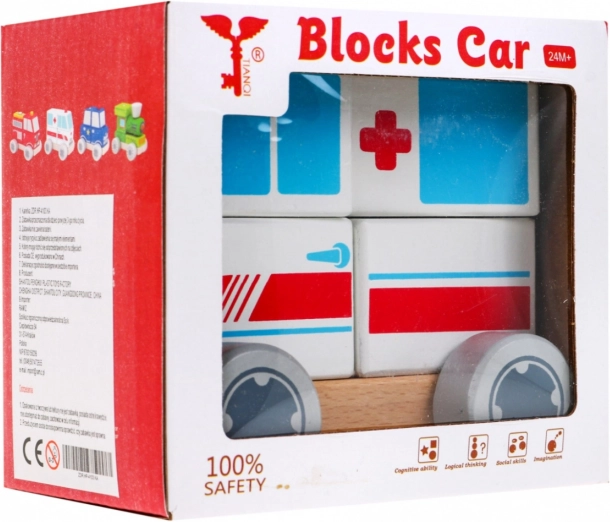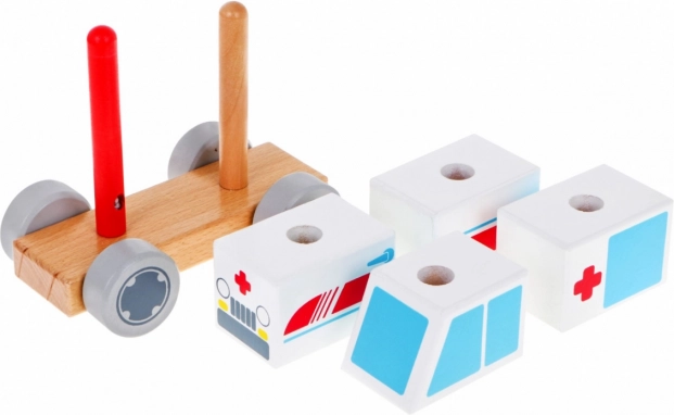 Dieser hölzerne Krankenwagen ist ideal für erste Bau- und Motorikspiele. Kinder stecken vier Klötze auf zwei Stifte in der Basis und bauen ihr eigenes Fahrzeug mit vertrauten Symbolen des Rettungsdienstes. Federnde Räder sorgen für eine geschmeidige Fahrt auf dem Boden und fördern Vorstellungskraft sowie thematisches Rollenspiel als Retter.