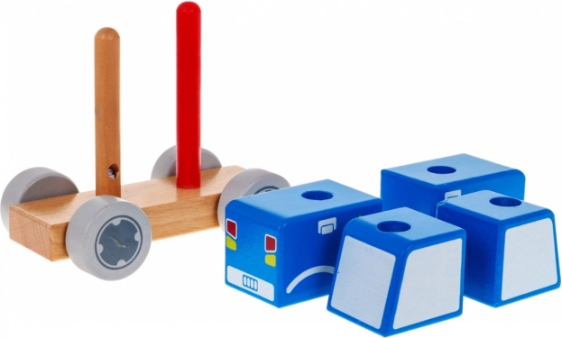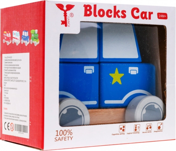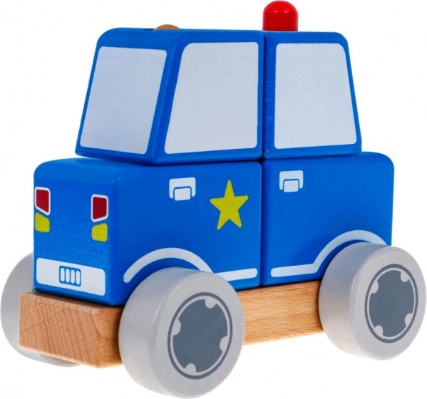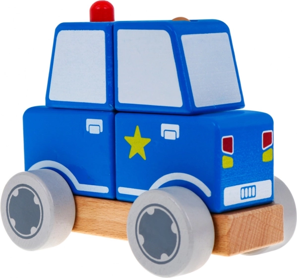 Vier Holzklötze werden auf zwei Stifte gesteckt und bilden gemeinsam ein realistisches kleines Polizeiauto. Ideal für erste logische Aufgaben.