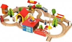 Entdecken Sie unbegrenzte Möglichkeiten mit diesem bunten Holzschienenset. Das Set enthält einen Bahnhof, Brücken, eine Hubschrauberlandeplattte, Figuren und weitere Teile, die es ermöglichen, eine eigene kleine Stadt zu bauen.