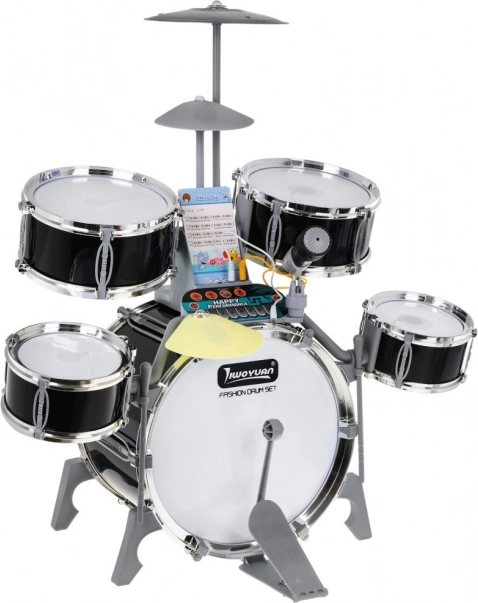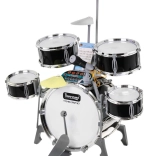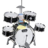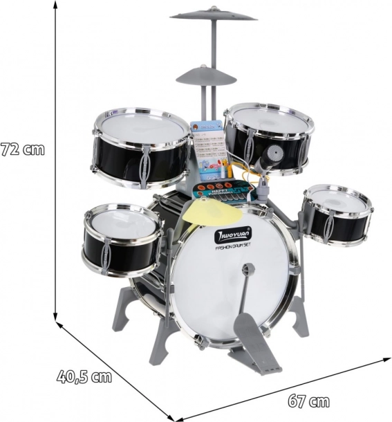 Das multifunktionale Kinder-Schlagzeugset enthält 5 Trommeln, 2 elektronische Becken (aus Kunststoff) und ein Metallbecken, Bedienfeld, Mikrofon, 2 Sticks und 6 Notenkarten für die einfache Erlernung des Spiels. Das Set wird durch drei AA-Batterien oder ein USB-Kabel betrieben.