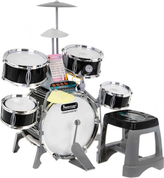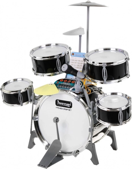 Das Schlagzeugset enthält alle notwendigen Teile für das Spielen: Trommeln in verschiedenen Größen, Mikrofon, Sticks und ein kleiner Tisch.